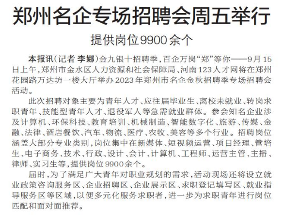 金九银十招聘季,百企万岗“郑”等你——9月15日上午,郑州市金水区人力资源和社会保障局、河南123人才网将在郑州花园路万达坊一楼大厅举办2023年郑州市名企金秋招聘季专场招聘会活动。(今日《郑州日报》5版)