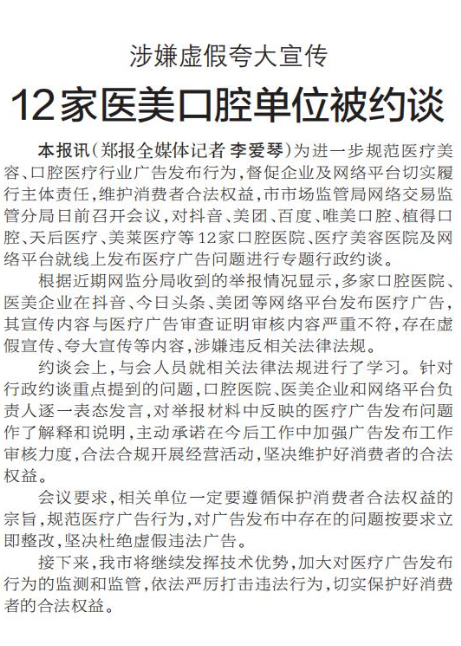为进一步规范医疗美容、口腔医疗行业广告发布行为,督促企业及网络平台切实履行主体责任,维护消费者合法权益,市市场监管局网络交易监管分局日前召开会议,对抖音、美团、百度、唯美口腔、植得口腔、天后医疗、美莱医疗等12家口腔医院、医疗美容医院及网络平台就线上发布医疗广告问题进行专题行政约谈。(今日《郑州日报》5版)