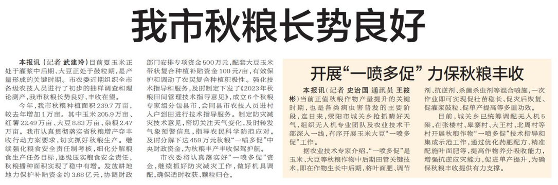 目前夏玉米正处于灌浆中后期、大豆正处于鼓粒期,是产量形成的关键时期。市农委近期组织全市各级农技人员进行了初步的抽样调查和理论测产,我市秋粮长势良好,丰收在望。(今日《郑州日报》7版)