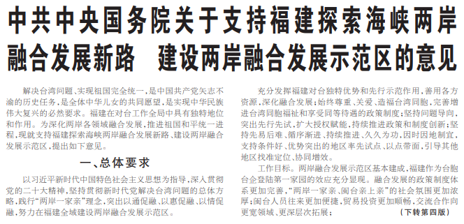 解决台湾问题、实现祖国完全统一,是中国共产党矢志不渝的历史任务,是全体中华儿女的共同愿望,是实现中华民族伟大复兴的必然要求。福建在对台工作全局中具有独特地位和作用。为深化两岸各领域融合发展,推进祖国和平统一进程,现就支持福建探索海峡两岸融合发展新路、建设两岸融合发展示范区,提出如下意见。(今日《人民日报》1版、4版)