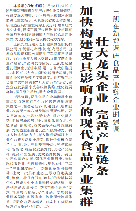 9月12日,省长王凯到新郑市调研食品产业链企业发展情况,强调要深入贯彻习近平总书记视察河南重要讲话重要指示,认真落实省委工作部署,以制造业高质量发展为主攻方向,培育壮大龙头企业,持续完善产业链条,加快构建在全国乃至全球更具影响力的现代食品产业集群,为现代化河南建设提供有力支撑。(今日《河南日报》1版)