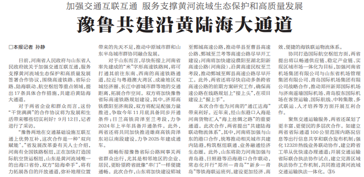日前,河南省人民政府与山东省人民政府就关于加强交通互联互通,服务支撑黄河流域生态保护和高质量发展签署合作协议,围绕高速铁路、省际公路、陆海联动、航空枢纽等重点领域,提出17条具体合作措施,共建沿黄陆海大通道。(今日《河南日报》1版)