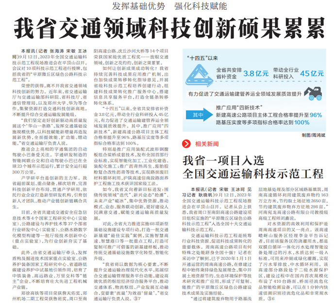 9月12日,2023年全国交通运输科技示范工程现场推进会在平顶山召开,会议对10项科技示范工程进行授牌,包括我省的“平原微丘区绿色公路科技示范工程”。(今日《河南日报》2版)