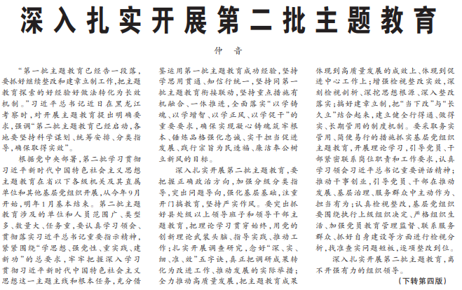 “第一批主题教育已经告一段落,要抓好继续整改和建章立制工作,把主题教育探索的好经验好做法转化为长效机制。”习近平总书记近日在黑龙江考察时,对开展主题教育提出明确要求,强调“第二批主题教育已经启动,各地要坚持科学谋划、统筹安排、分类指导,确保取得实效”。(今日《人民日报》1版、4版)