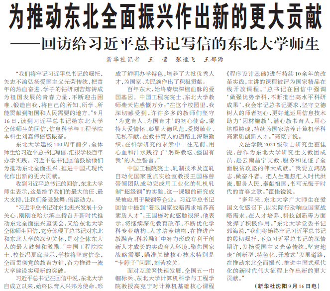 中共中央总书记、国家主席、中央军委主席习近平9月15日给东北大学全体师生回信,在东北大学建校100周年之际,向全校师生员工、广大校友致以热烈的祝贺和诚挚的问候。