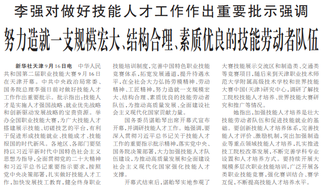 中华人民共和国第二届职业技能大赛9月16日在天津开幕。中共中央政治局常委、国务院总理李强日前对做好技能人才工作作出重要批示。批示指出:技能人才是实施人才强国战略、就业优先战略和创新驱动发展战略的宝贵资源。举办全国职业技能大赛,为广大技能人才搭建展示技能、切磋技艺的平台,有利于促进形成技能就业、技能成才、技能报国的时代新风。各地区、各部门要坚持以习近平新时代中国特色社会主义思想为指导,全面贯彻党的二十大精神和习近平总书记重要指示要求,按照党中央决策部署,扎实做好技能人才工作,加快发展技工教育,健全终身职业技能培训制度,完善中国特色职业技能竞赛体系,拓宽发展通道,提升待遇水平,在全社会大力弘扬劳模精神、劳动精神、工匠精神,努力造就一支规模宏大、结构合理、素质优良的技能劳动者队伍,为推动高质量发展、全面建设社会主义现代化国家贡献力量。(今日《人民日报》1版)