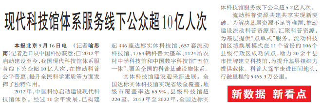 现代科技馆体系服务线下公众超10亿人次