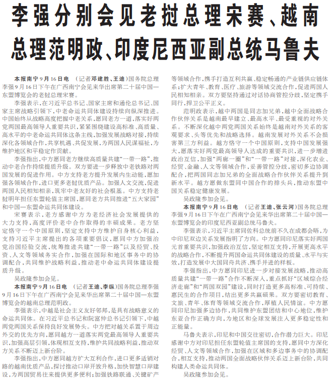 国务院总理李强9月16日下午在广西南宁会见来华出席第二十届中国—东盟博览会的老挝总理宋赛。(今日《人民日报》2版)
