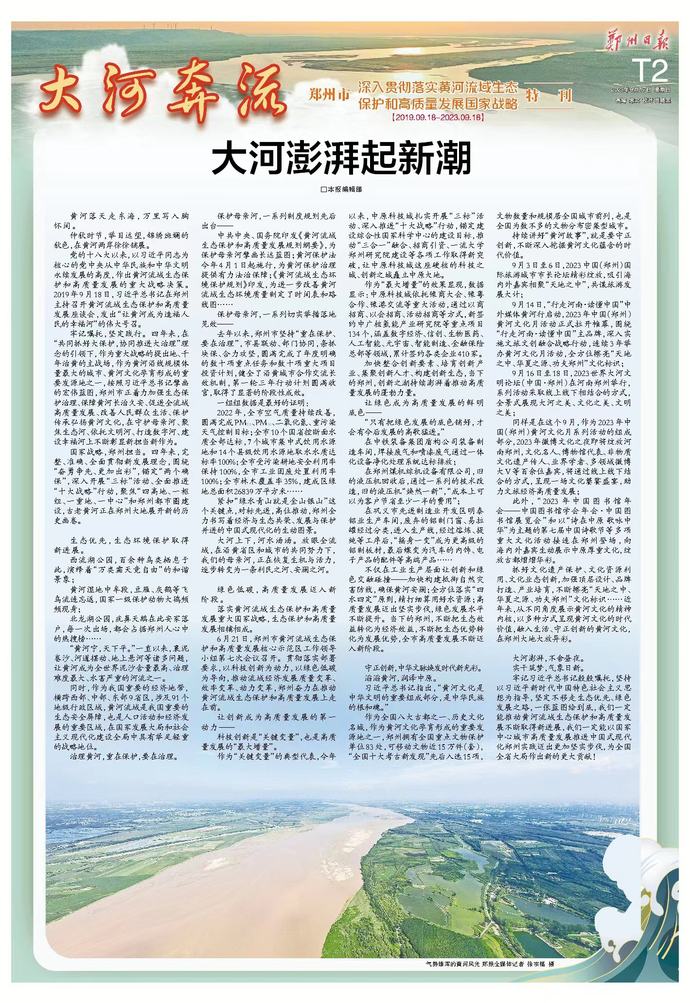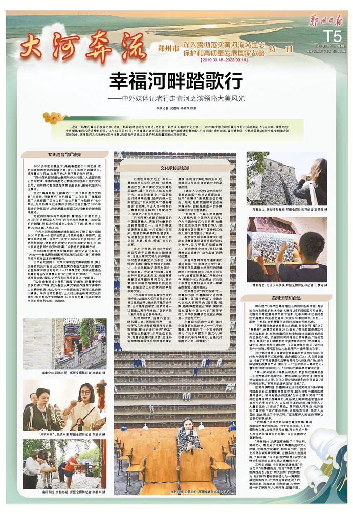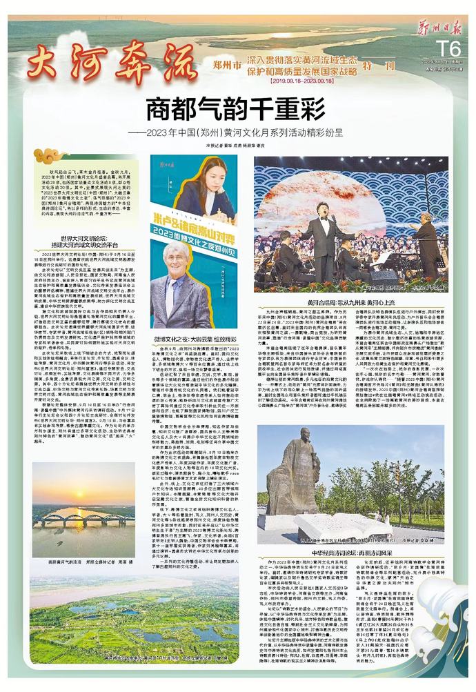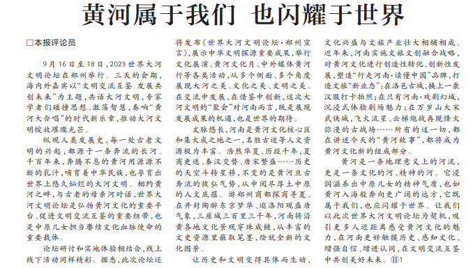 9月16日至18日,2023世界大河文明论坛在郑州举行。三天的会期,海内外嘉宾以“文明交流互鉴发展共创未来”为主题,共话大河文明,专家学者们碰撞思想、激荡智慧,奏响“黄河大合唱”的时代新乐章,推动大河文明绽放璀璨光芒。(今日《河南日报》1版)