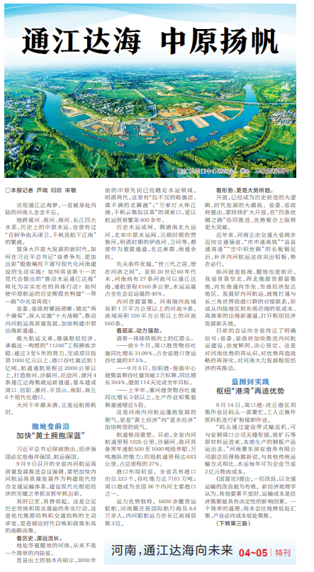 地跨黄河、淮河、海河、长江四大水系,历史上的中原水运,也曾有过“百舸争流天津卫,千帆竞航下江南”的繁盛。(今日《河南日报》1版、3版)