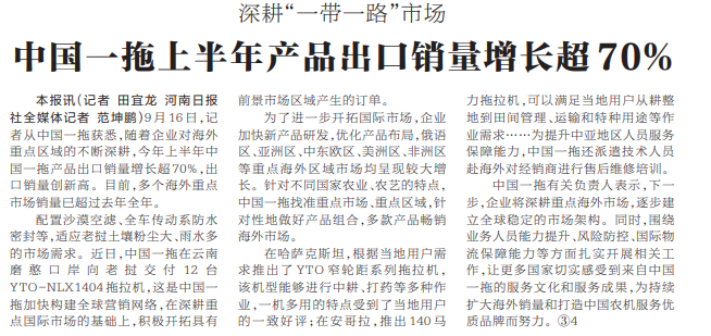 9月16日,记者从中国一拖获悉,随着企业对海外重点区域的不断深耕,今年上半年中国一拖产品出口销量增长超70%,出口销量创新高。目前,多个海外重点市场销量已超过去年全年。(今日《河南日报》1版)