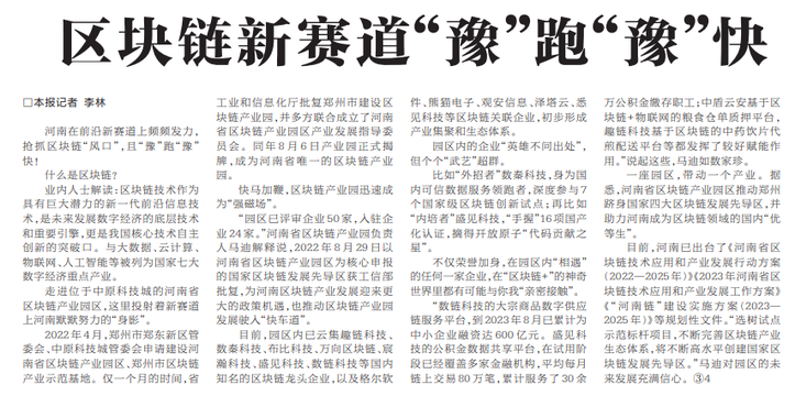 河南在前沿新赛道上频频发力,抢抓区块链“风口”,且“豫”跑“豫”快!(今日《河南日报》2版)