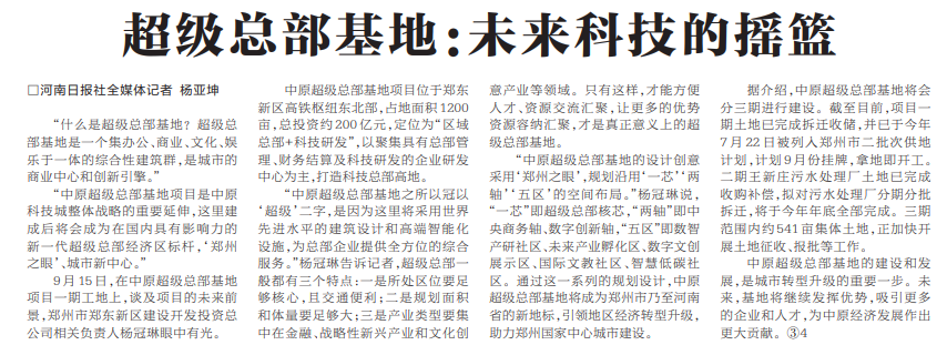 “什么是超级总部基地?超级总部基地是一个集办公、商业、文化、娱乐于一体的综合性建筑群,是城市的商业中心和创新引擎。”(今日《河南日报》2版)