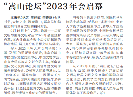 9月16日上午,“嵩山论坛——华夏文明与世界文明对话”2023年会在登封开幕,海内外嘉宾齐聚嵩山脚下,展开思想交流与碰撞。(今日《郑州日报》2版)