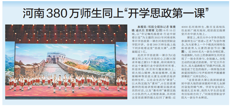 9月15日晚,以“牢记嘱托践使命 行走中原看巨变”为主题的2023年河南省秋季开学思政第一课在河南经贸职业学院开讲。全省380万师生线上线下同步收看这堂“思政大课”,点赞量超过1亿。(今日《郑州日报》2版)