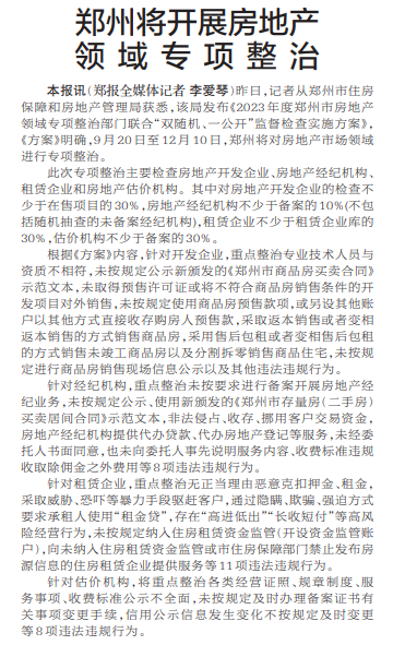 昨日,记者从郑州市住房保障和房地产管理局获悉,该局发布《2023年度郑州市房地产领域专项整治部门联合“双随机、一公开”监督检查实施方案》,《方案》明确,9月20日至12月10日,郑州将对房地产市场领域进行专项整治。(今日《郑州日报》2版)