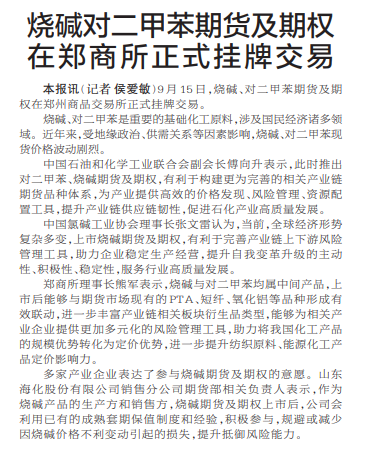 9月15日,烧碱、对二甲苯期货及期权在郑州商品交易所正式挂牌交易。(今日《郑州日报》2版)