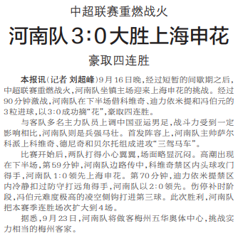 9月16日晚,经过短暂的间歇期之后,中超联赛重燃战火,河南队坐镇主场迎来上海申花的挑战。经过90分钟激战,河南队在下半场借科维奇、迪力依米提和冯伯元的3粒进球,以3∶0成功摘“花”,豪取四连胜。(今日《郑州日报》2版)