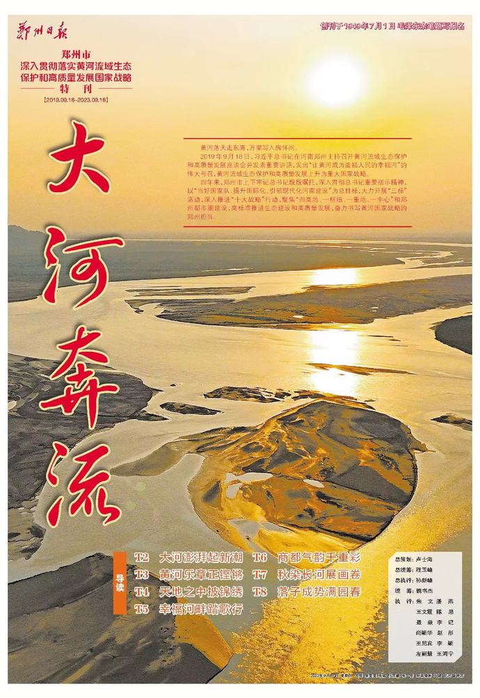 四年来,郑州市上下牢记总书记殷殷嘱托,深入贯彻总书记重要指示精神,以“当好国家队、提升国际化、引领现代化河南建设”为总目标,大力开展“三标”活动,深入推进“十大战略”行动,聚焦“四高地、一枢纽、一重地、一中心”和郑州都市圈建设,高标准推进生态建设和高质量发展,奋力书写黄河国家战略的郑州担当。(今日《郑州日报》1版、T1~T8版)