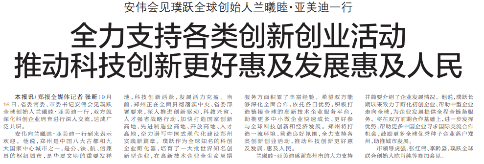 市领导虎强、张红伟、李黔淼,璞跃全球联合创始人陈肖纯等参加会见。(今日《郑州日报》1版)