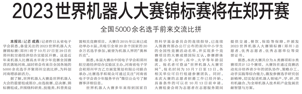 记者昨日从省电子学会获悉,备受关注的2023世界机器人大赛锦标赛(郑州)将于10月27日至29日在郑州航空港经济综合实验区开赛。这是近年来机器人比赛高水平青少年竞赛全国赛首次落地河南,届时将会有来自全国各地的5000余名选手齐聚郑州交流比拼,为科创河南增添新活力。(今日《郑州日报》2版)