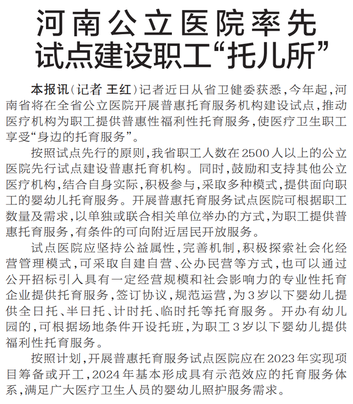 记者近日从省卫健委获悉,今年起,河南省将在全省公立医院开展普惠托育服务机构建设试点,推动医疗机构为职工提供普惠性福利性托育服务,使医疗卫生职工享受“身边的托育服务”。(今日《郑州日报》2版)