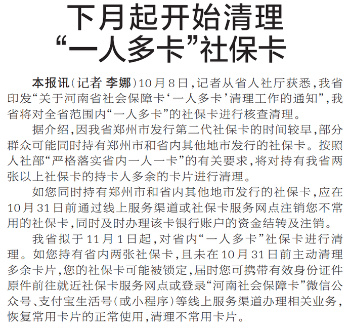 10月8日,记者从省人社厅获悉,我省印发“关于河南省社会保障卡‘一人多卡’清理工作的通知”,我省将对全省范围内“一人多卡”的社保卡进行核查清理。(今日《郑州日报》2版)