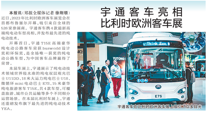 近日,2023年比利时欧洲客车展览会在首都布鲁塞尔开幕,吸引来自全球的526家参展商。宇通客车携4款最新高端纯电动车型亮相,并发布最先进的纯电动技术。(今日《郑州日报》2版)