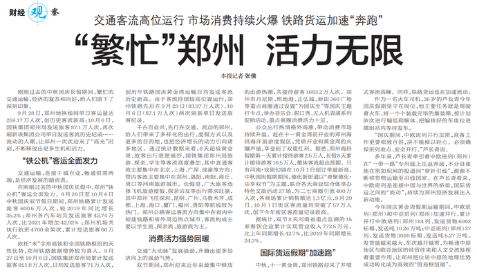 9月28日,郑州地铁线网单日客运量达259.17万人次,创历史客流新高;10月6日,国铁集团郑州局发送旅客87.1万人次,再次刷新该集团公司单日发送客流历史纪录……流动的人潮,让郑州一次次迎来了“高光”时刻,不断释放出更多生机和活力。(今日《郑州日报》6版)