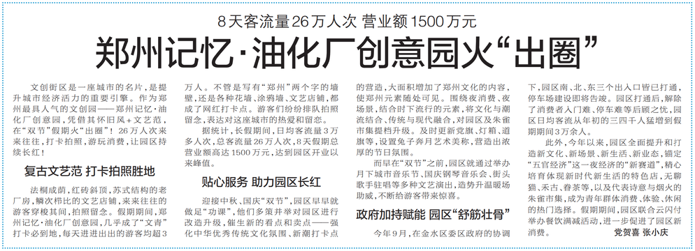 文创街区是一座城市的名片,是提升城市经济活力的重要引擎。作为郑州最具人气的文创园——郑州记忆·油化厂创意园,凭借其怀旧风+文艺范,在“双节”假期火“出圈”!26万人次来来往往,打卡拍照,游玩消费,让园区持续长红!(今日《郑州日报》7版)