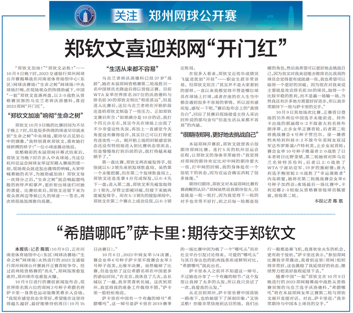 “郑钦文加油!”“郑钦文必胜!”……10月9日晚7时,2023交通银行郑州网球公开赛揭幕战在河南省体育场馆中心(东区)网球决赛场(“生命之树”网球场)中央球场打响,在现场观众的热情助威下,中国“一姐”郑钦文直落两盘,以2∶0战胜从资格赛突围的乌克兰老将沃洛德科,喜迎2023郑网“开门红”。(今日《郑州日报》8版)