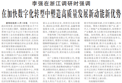 中共中央政治局常委、国务院总理李强10月7日至9日在浙江调研。他强调,要深入学习贯彻习近平总书记关于数字经济发展和新型工业化的重要指示精神,落实全国新型工业化推进大会部署,从战略全局高度做强做优做大数字经济,在加快数字化转型中赋能经济社会发展,塑造高质量发展新动能新优势。(今日《人民日报》1版)