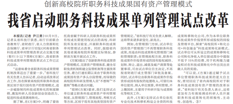 10月9日,记者从省科技厅获悉,该厅日前联合省教育厅、省财政厅、省人力资源和社会保障厅、省审计厅印发《河南省职务科技成果单列管理改革试点实施方案(暂行)》,我省职务科技成果单列管理改革试点工作已正式启动。(今日《河南日报》2版)