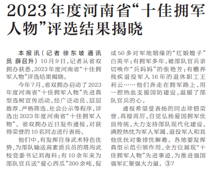 10月9日,记者从省双拥办获悉,2023年度河南省“十佳拥军人物”评选结果揭晓。(今日《河南日报》2版)