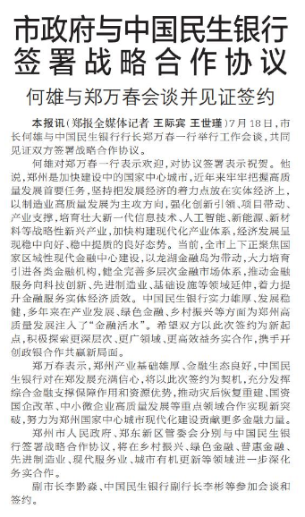 7月18日,市长何雄与中国民生银行行长郑万春一行举行工作会谈,共同见证双方签署战略合作协议。(今日《郑州日报》1版)