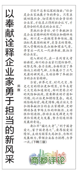 习近平总书记深刻指出:“社会是企业家施展才华的舞台。只有真诚回报社会、切实履行社会责任的企业家,才能真正得到社会认可,才是符合时代要求的企业家。”(今日《郑州日报》1版、2版)