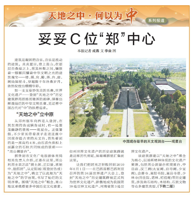 建筑是凝固的音乐,音乐是流动的建筑。炎炎夏日,登上嵩山,在那层峦叠嶂之上、葱茏林壑之间,镶嵌着一颗颗闪耀着中华文明之光的建筑瑰宝——楼、阁、宫、殿、塔、台、廊、阙灿如星斗,穿越数千年沧桑岁月,依然绽放出熠熠华彩。(今日《郑州日报》1版、2版)
