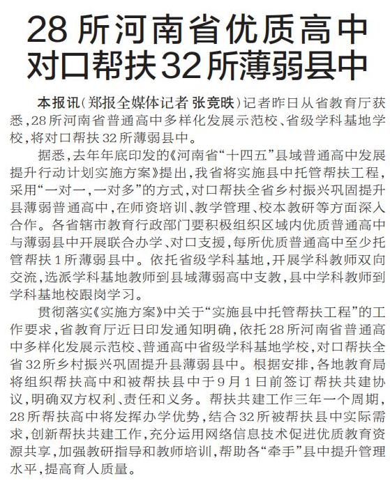 记者昨日从省教育厅获悉,28所河南省普通高中多样化发展示范校、省级学科基地学校,将对口帮扶32所薄弱县中。(今日《郑州日报》2版)