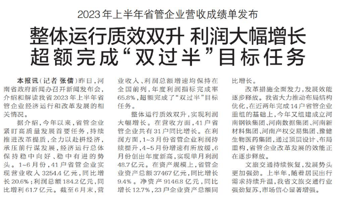 昨日,河南省政府新闻办召开新闻发布会,介绍和解读我省2023年上半年省管企业经济运行和改革发展的相关情况。(今日《郑州日报》2版)