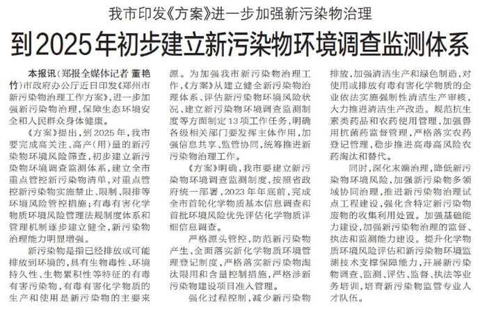 市政府办公厅近日印发《郑州市新污染物治理工作方案》,进一步加强新污染物治理,保障生态环境安全和人民群众身体健康。(今日《郑州日报》2版)