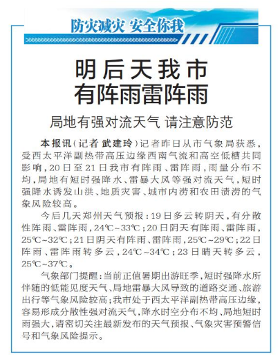 记者昨日从市气象局获悉,受西太平洋副热带高压边缘西南气流和高空低槽共同影响,20日至21日我市有阵雨、雷阵雨,雨量分布不均,局地有短时强降水、雷暴大风等强对流天气,短时强降水诱发山洪、地质灾害、城市内涝和农田渍涝的气象风险较高。(今日《郑州日报》2版)