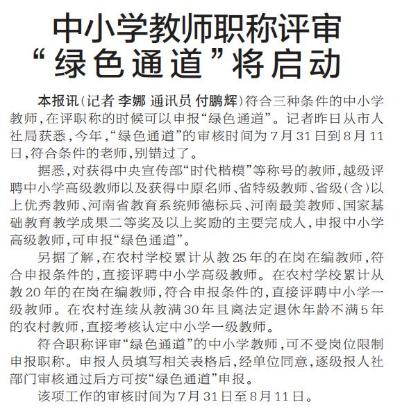 符合三种条件的中小学教师,在评职称的时候可以申报“绿色通道”。记者昨日从市人社局获悉,今年,“绿色通道”的审核时间为7月31日到8月11日,符合条件的老师,别错过了。(今日《郑州日报》2版)