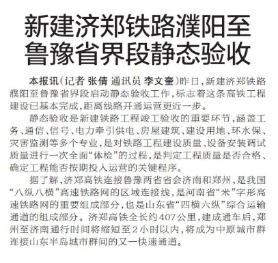 昨日,新建济郑铁路濮阳至鲁豫省界段启动静态验收工作,标志着这条高铁工程建设已基本完成,距离线路开通运营更近一步。(今日《郑州日报》5版)