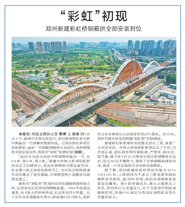 18日上午,随着合龙指令的发出,郑州新建彩虹桥主桥中跨最后一节钢箱拱缓缓吊放。记者在彩虹桥项目现场看到,最后一节钢箱拱精准合龙到位,该桥钢箱拱全部安装完毕,桥梁的“彩虹”轮廓初现。(今日《郑州日报》5版)