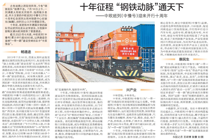 古有丝绸之路驼铃阵阵,今有“钢铁驼队”驰骋不息。7月18日上午,一列满载太阳能光伏组件、线路板分总成、风车支架的中欧班列(中豫号)开行十周年纪念班列从郑州铁路中心站驶出(如图),经阿拉山口开往德国汉堡。(今日《郑州日报》5版)