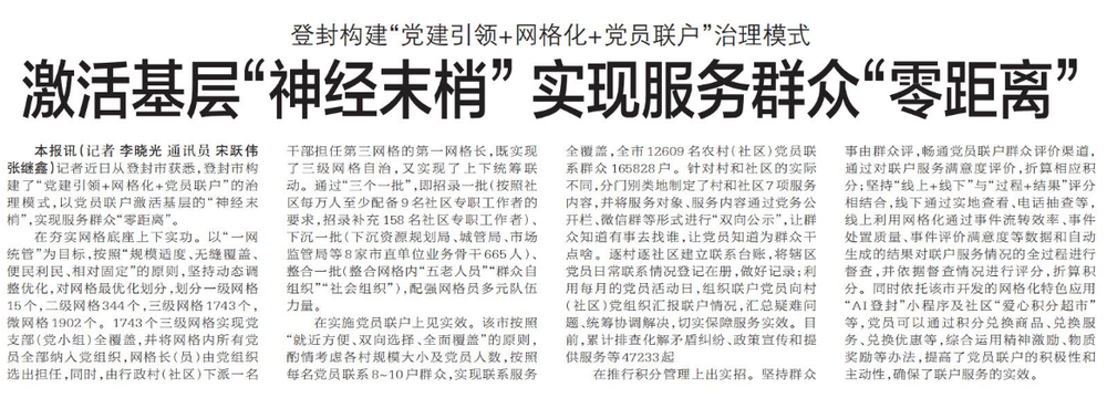 记者近日从登封市获悉,登封市构建了“党建引领+网格化+党员联户”的治理模式,以党员联户激活基层的“神经末梢”,实现服务群众“零距离”。(今日《郑州日报》7版)