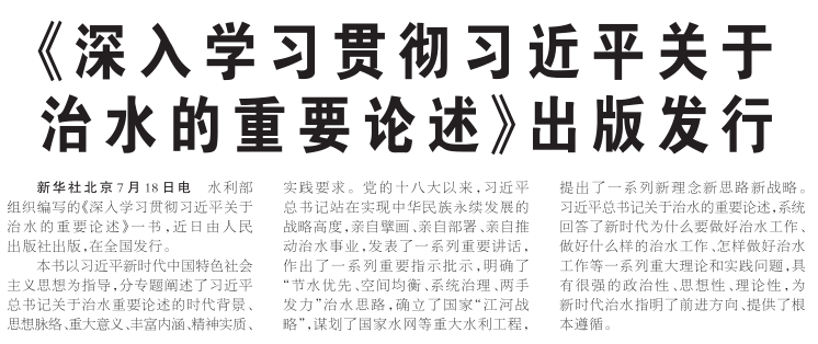 水利部组织编写的《深入学习贯彻习近平关于治水的重要论述》一书,近日由人民出版社出版,在全国发行。