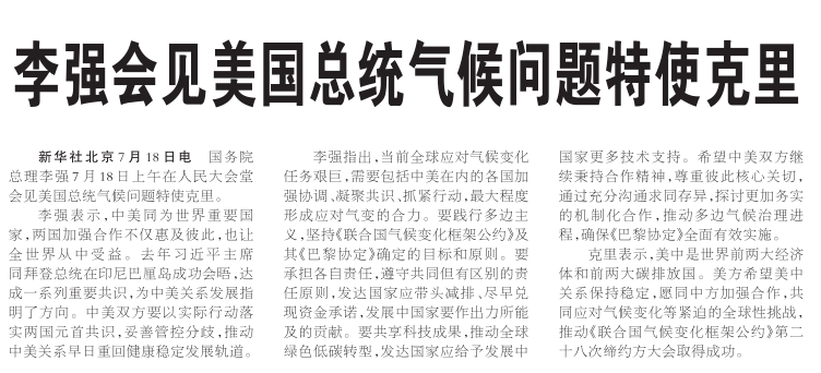 国务院总理李强7月18日上午在人民大会堂会见美国总统气候问题特使克里。