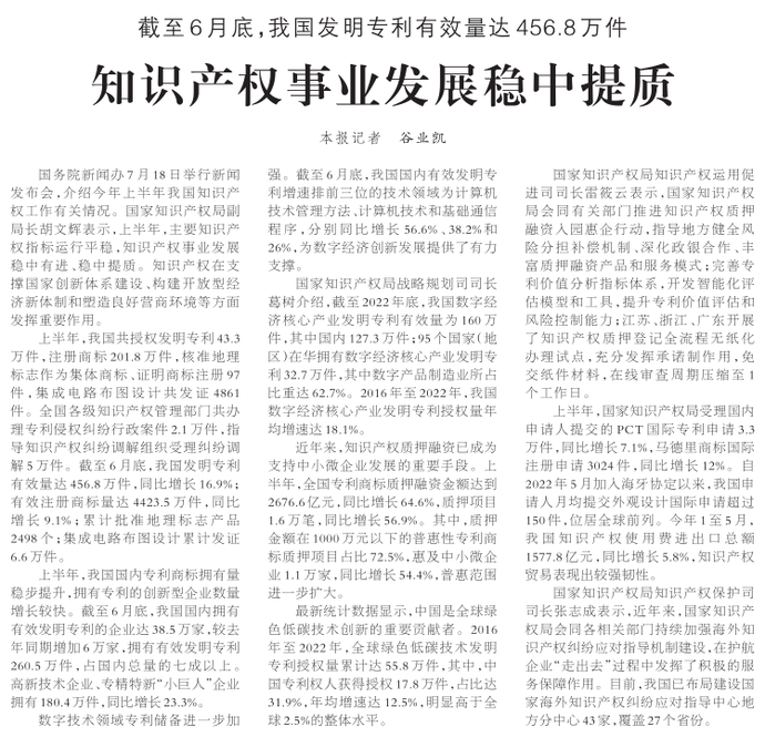 国务院新闻办7月18日举行新闻发布会,介绍今年上半年我国知识产权工作有关情况。国家知识产权局副局长胡文辉表示,上半年,主要知识产权指标运行平稳,知识产权事业发展稳中有进、稳中提质。知识产权在支撑国家创新体系建设、构建开放型经济新体制和塑造良好营商环境等方面发挥重要作用。(今日《人民日报》2版)