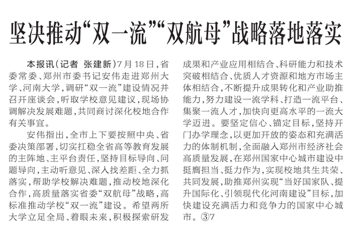 7月18日,省委常委、郑州市委书记安伟走进郑州大学、河南大学,调研“双一流”建设情况并召开座谈会,听取学校意见建议,现场协调解决发展难题,共同商讨深化校地合作有关事宜。(今日《河南日报》2版)